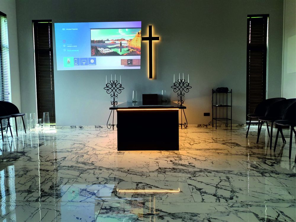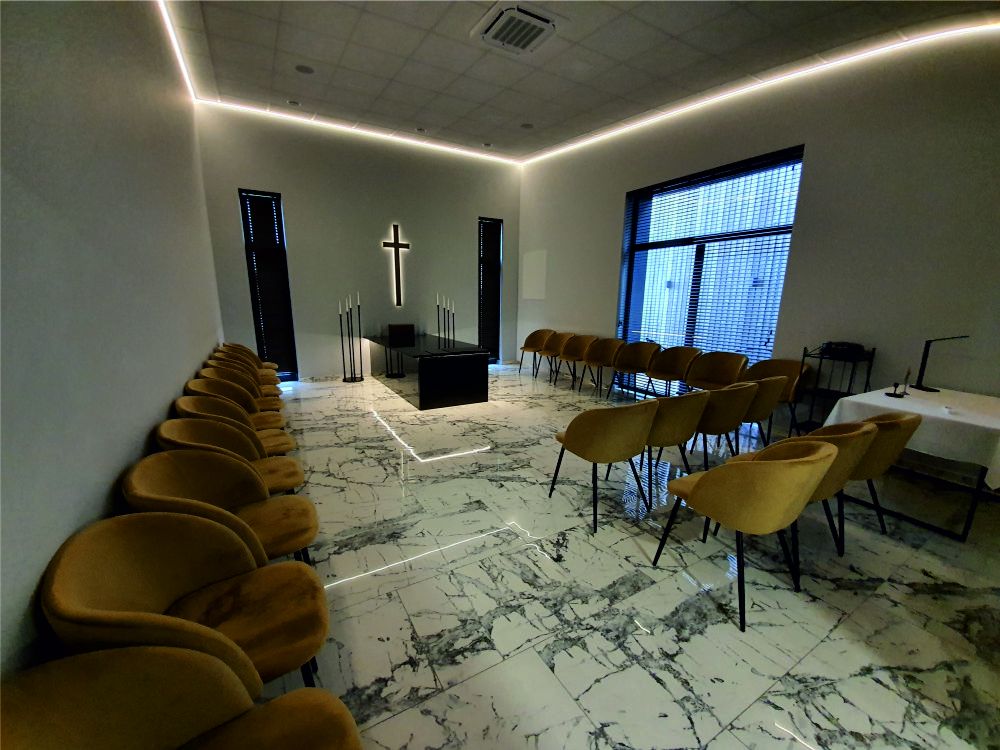 pageidaujamą šviesos intensyvumą, taip pat ir kondicionavimo sistema, pagal poreikį bus galima naudotis multimedija, kompiuterine įranga ar TV ekranais, norint sukurti jaukią aplinką rodant gražius prisiminimus apie mirusįjį.